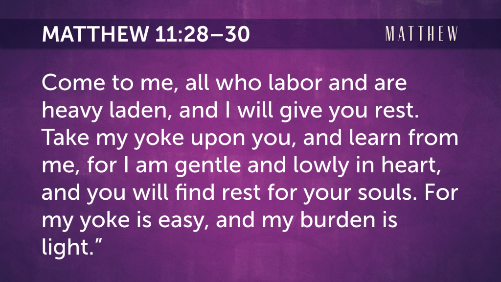 This in fact is the “easy” yoke and the “light” burden – to come to Him alone, and to trust Him alone, having believed Him alone. Come and be mine. Be yoked to me. That is the whole of it. And I will give you rest. I am meek, and approachable. Lowly, you need not raise yourself up to some level first. Just come.