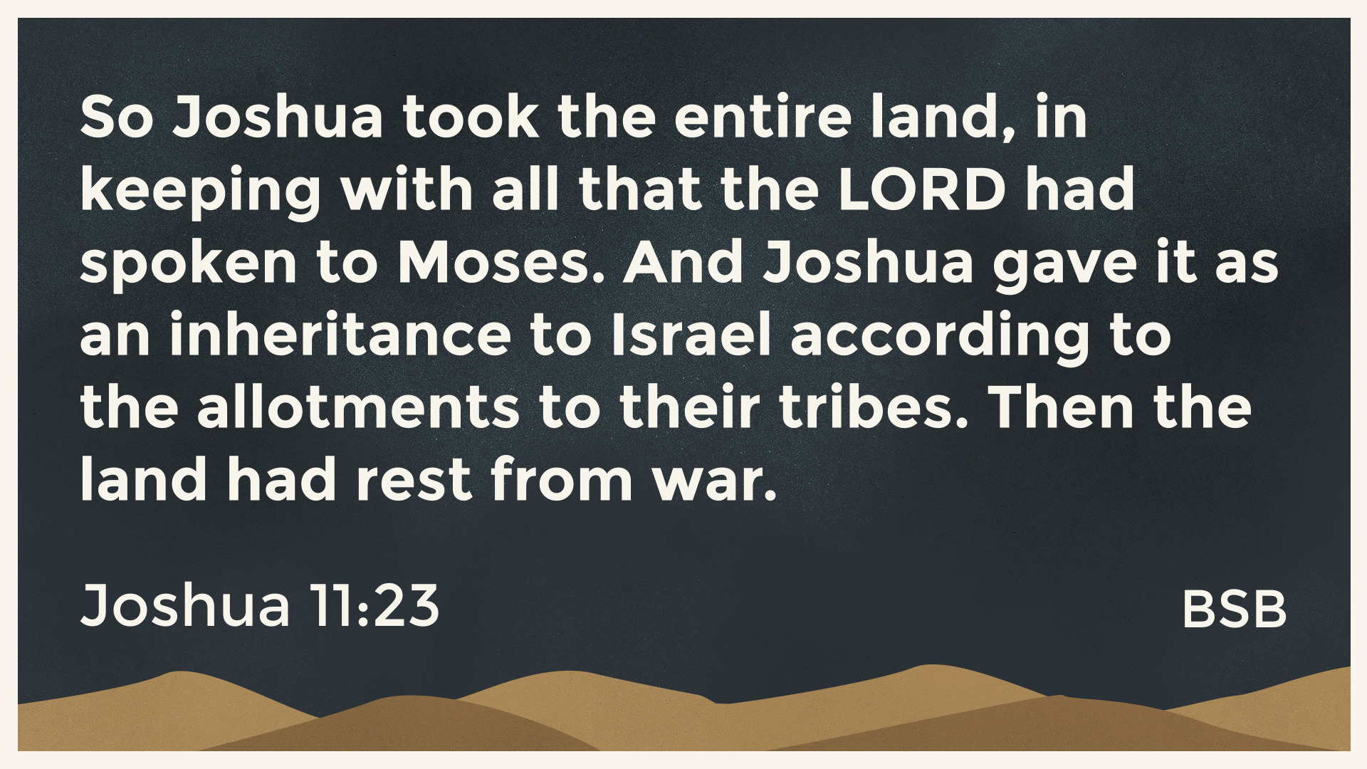 “So Joshua took the whole land, according to all that the Lord had spoken to Moses. And Joshua gave it for an inheritance to Israel according to their tribal allotments. And the land had rest from war.” ESV Jos 11:23.