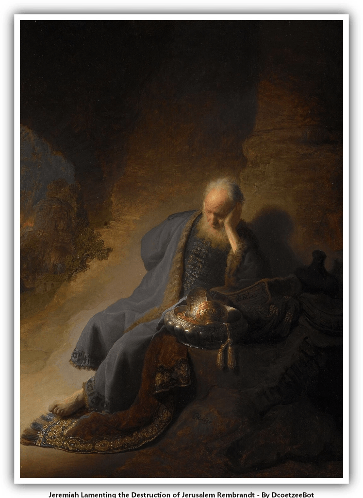 This is perhaps my favorite painting of all time. It is Rembrandt’s take on Jeremiah – “the weeping prophet” lamenting while Jerusalem burns in the background. It is most poignant.