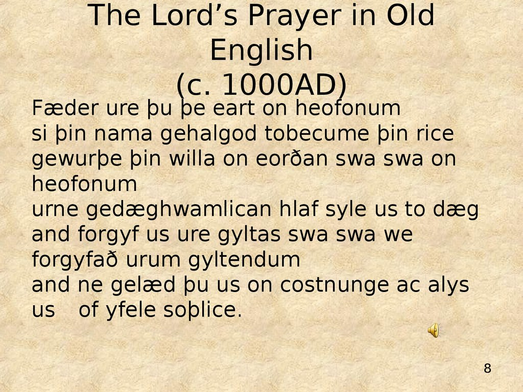 Thirteenth Century – Manuscript in the Library of Cambridge University: Fader oure that art in heve, i-halgeed be thi nome, i-cume thi kinereiche, y-worthe thi wylle also is in hevene so be an erthe, oure iche-dayes-bred gif us today, and forgif us our gultes, also we forgifet oure gultare, and ne led ows nowth into fondingge, auth ales ows of harme.